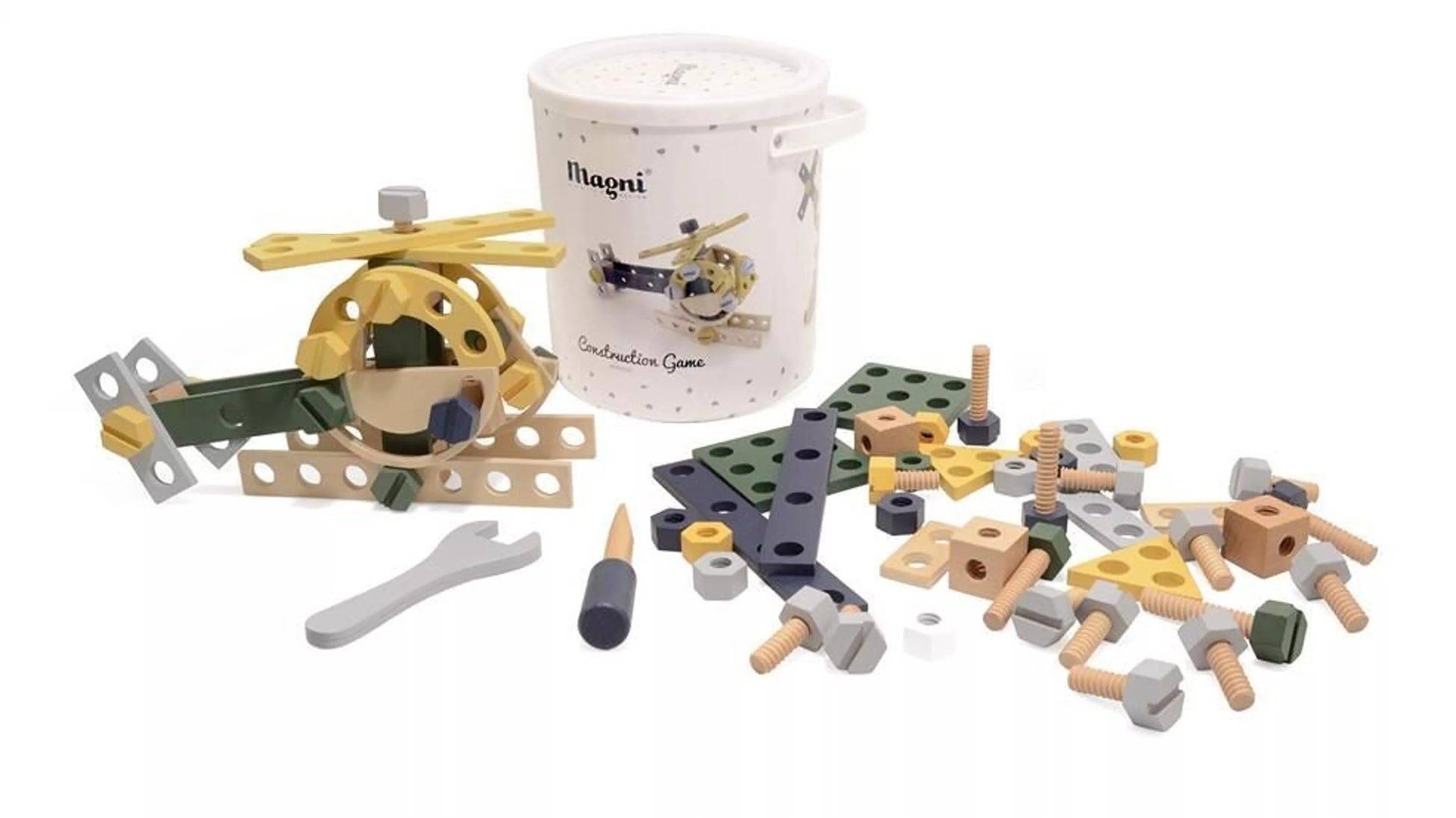 Dieses hochwertige Konstruktionsset aus Holz lädt Kinder dazu ein, eigene Fahrzeuge, Fantasiegebilde oder einfache Maschinen zu bauen. Mit Schrauben, Leisten, Platten und Werkzeug können immer neue Formen entstehen – frei nach Lust und Laune.